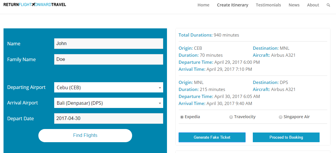 • Fake return ticket for only $3.99. Where you only put your personal information and we will find all the available flights and airline for you.